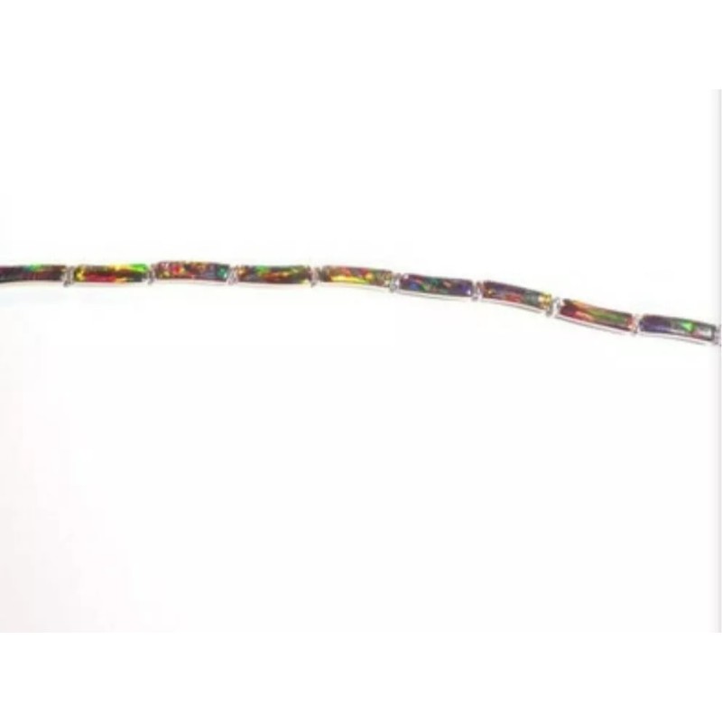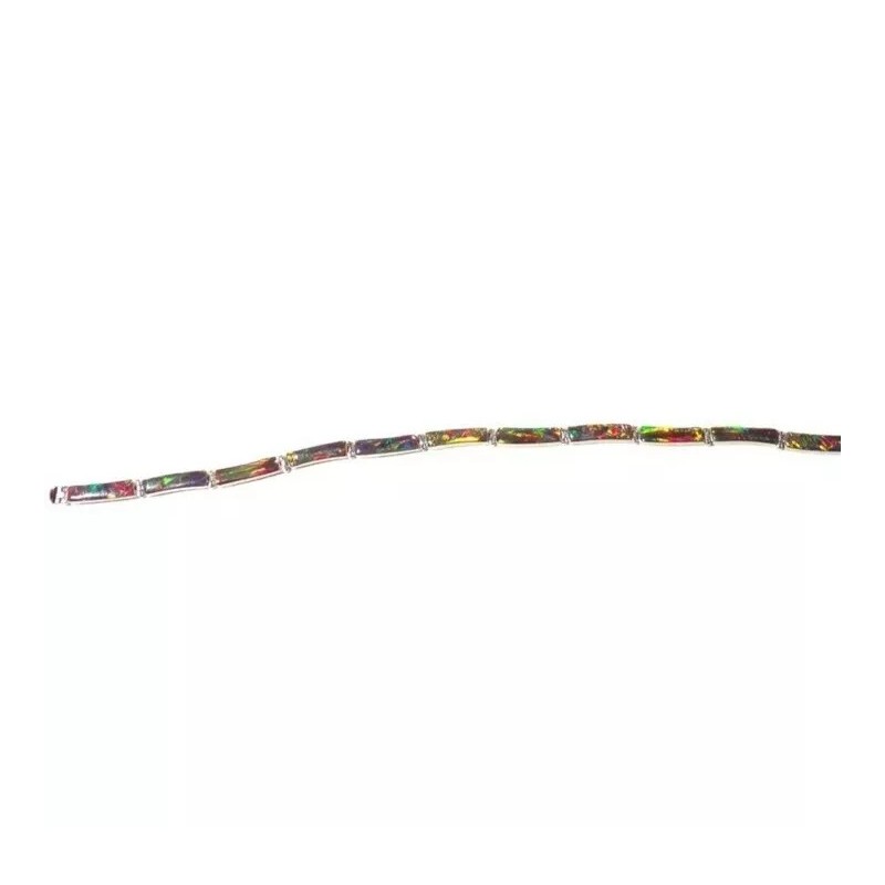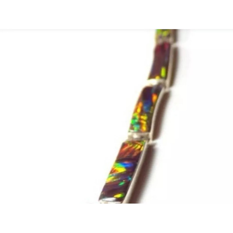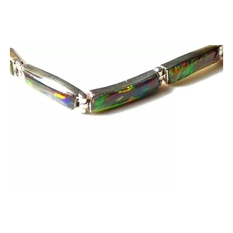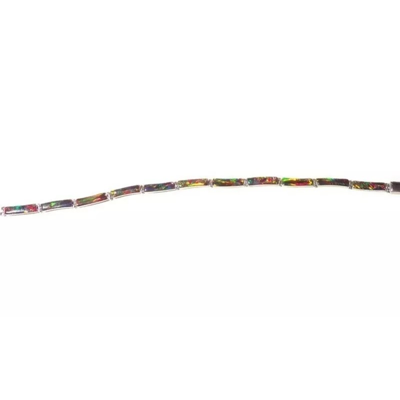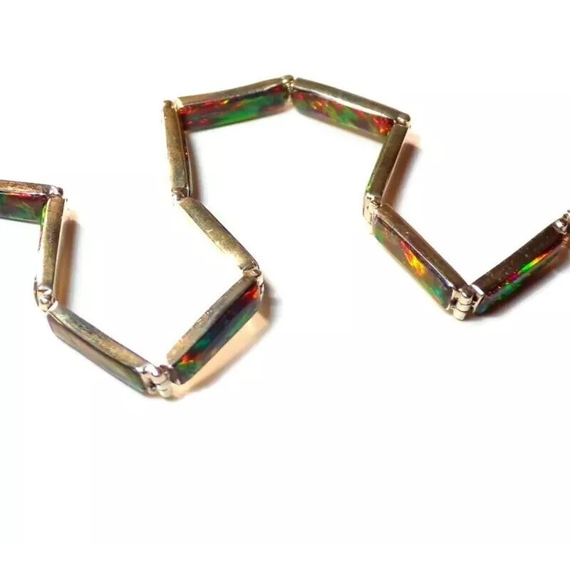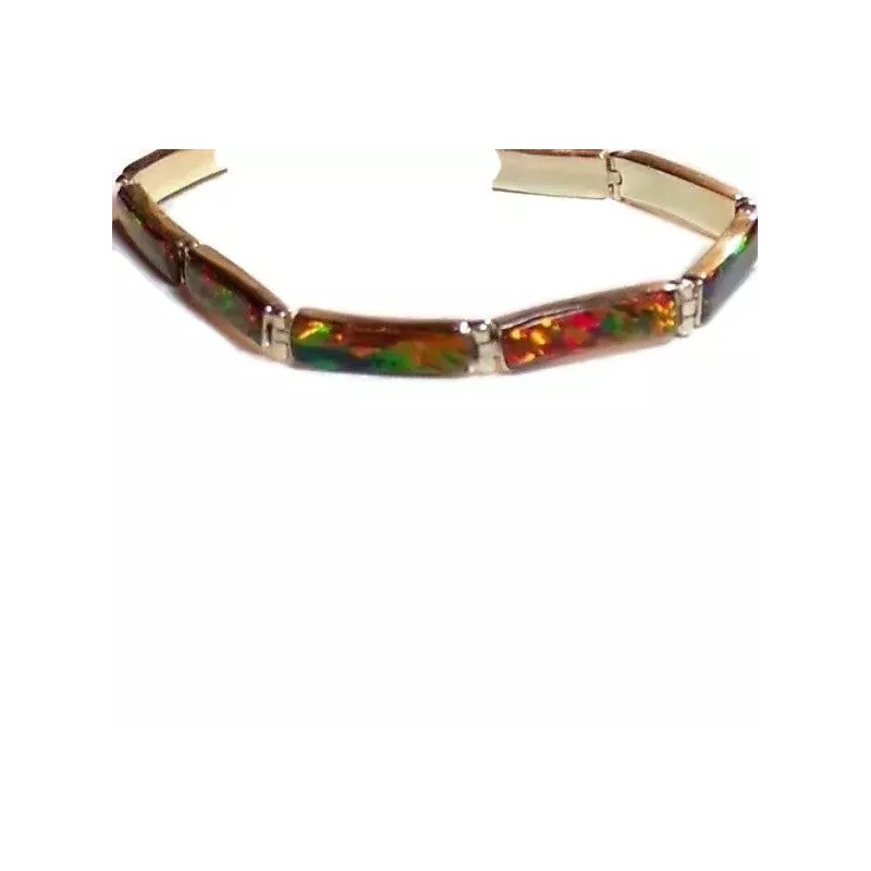 You won't be able to keep your hands or eyes off this exceptionally beautiful unique glowing bracelet. Exquisitely crafted in smooth-as-glass glossy changing color. Flexible molds to your arm. Embellished with graceful hand picked and mosaic cut opals. Accented by glowing details and luscious fire glowing opal. This remarkable jewel changes color as you walk and change lighting.