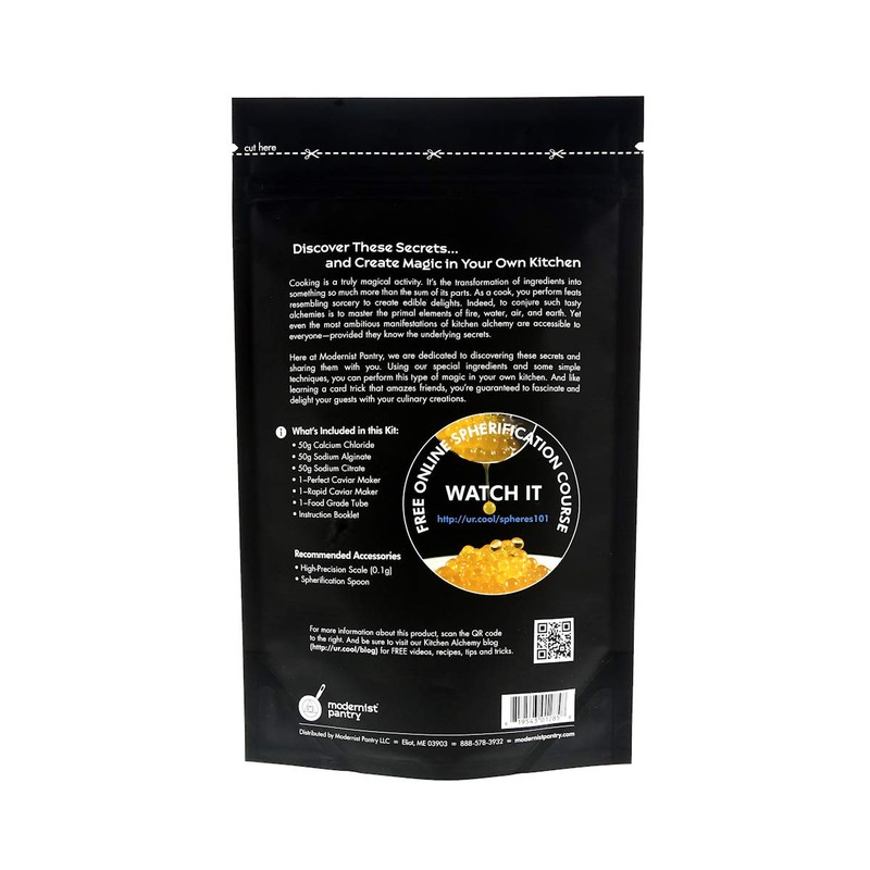 - Contains enough ingredients for 17 cups of spherified liquids.
