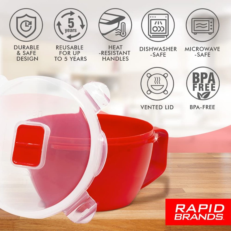 • EASY LUNCH -- Reheat noodles, beverages, or soup in a flash! For days when you need a quick and hot meal, the Rapid Soup Mug cooks your favorite leftovers or soup in the microwave. Comes with a vented lid for temperature control.
