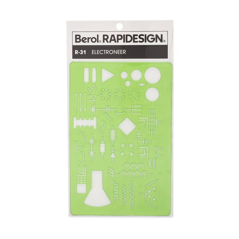 Rapidesign Electroneer Template (#R31) contain all diagrammatic elements of electronic and cathode ray tubes plus tube bases of 4, 7, and 8 prong type, in addition to all symbols in the field of electronics. Cut-outs beveled for inking. Made in USA. Rapidesign has the world's largest selection of drafting templates for architects, builders, engineers and graphic designers.