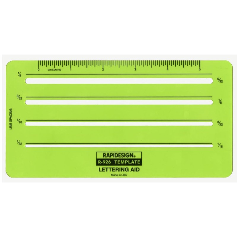 Rapidesign Lettering Aid Template features 1/16, 3/32, 1/8, and 5/32 inch sized slots for freehand lettering or as drawing guide lines. Inch scale included. Guide lines for equidistant spacing. Made in USA. Rapidesign has the world's largest selection of drafting templates for architects, builders, engineers and graphic designers.