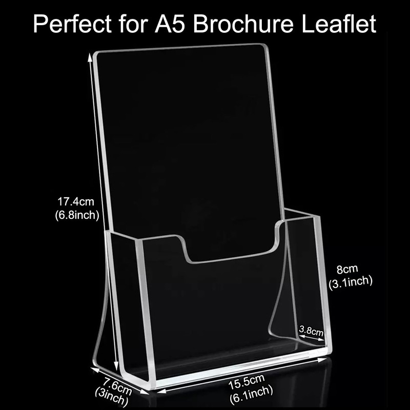 - 【Perfect for A5 Brochure Leaflet】Material: Transparent acrylic. Thickness: 3mm. Package including: 2 Pack. Standard: A5 size applied. Body size: 17.4x15.5x7.6x8cm/6.8x6.1x3x3.1inch.The brochure holder is hand-made for placing A5 brochure leaflet booklet literature flyer catalog magazine.
