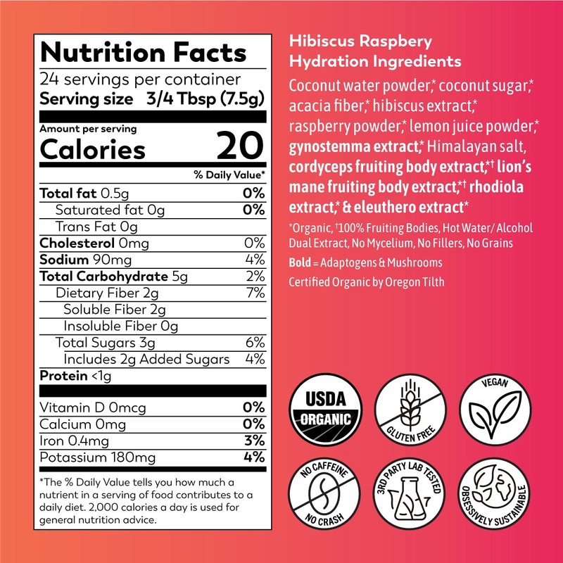 Rasa Raspberry Hibiscus Hydration | Organic Boosted Iced Tea with Adaptogens and Mushrooms | Gluten-Free, Premium Electrolyte Powder Drink Mix, Refreshing Hydration (6 oz / 24 Servings)
