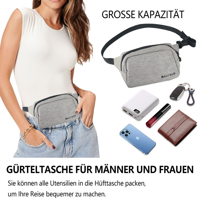 Rasfalo Bum Bag for Men and Women, Large Capacity Belt Bag with Adjustable Shoulder Strap for Running, Yoga, Jogging, Hiking, Hands-Free Carry All Phones, Flax Grey, Style 01