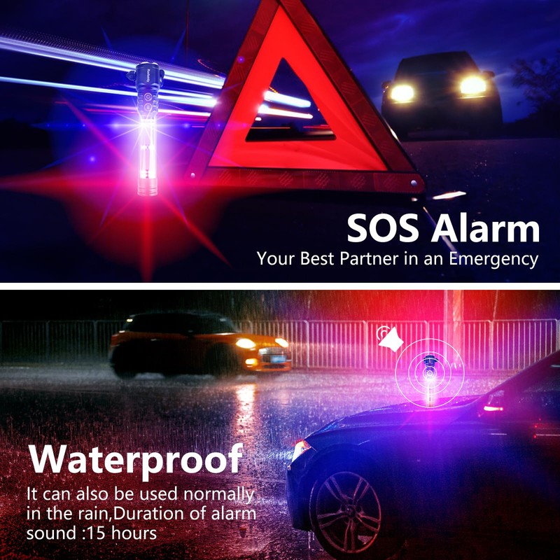 - 【Lighting time】High lumen value,flashlight rechargeable,powerful flashlights,bright flashlight,Car LED flashlight ,main light (100 % 4-5 hours, 50% 7-8 hours. strobe flash 7-8 hours) . COB sidelight's white light mode (100% 7-8 hours. 50% 9-10 hours). Alternating red and blue flashes on the side (sos18-20 hours),High power mode is ideal for long-distance lighting, while low power mode is perfect for close range lighting. The strobe mode serves as an emergency alarm signal. The white light mode of COB provides unified illumination for reading and detailed tasks. The red and blue flash modes provide a clear emergency call for help signal, improving safety