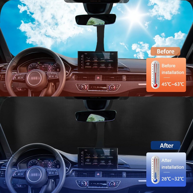 - Windschutzscheiben-Sonnenschutz Senkt die Temperatur im Auto, indem er die meisten UV-Strahlen blockiert und so den Hitzestau reduziert. So bleibt Ihr Auto effektiv khl.