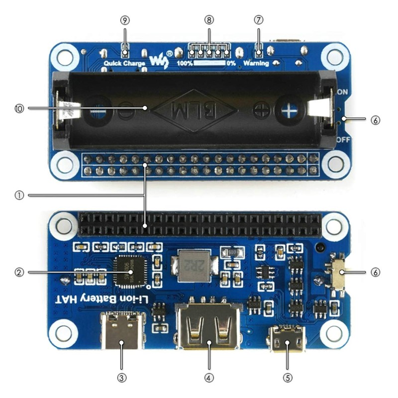 The Li-ion Battery HAT integrates SW6106 power bank management chip, allows providing 5V regulated power supply to your Pi from a 14500 battery