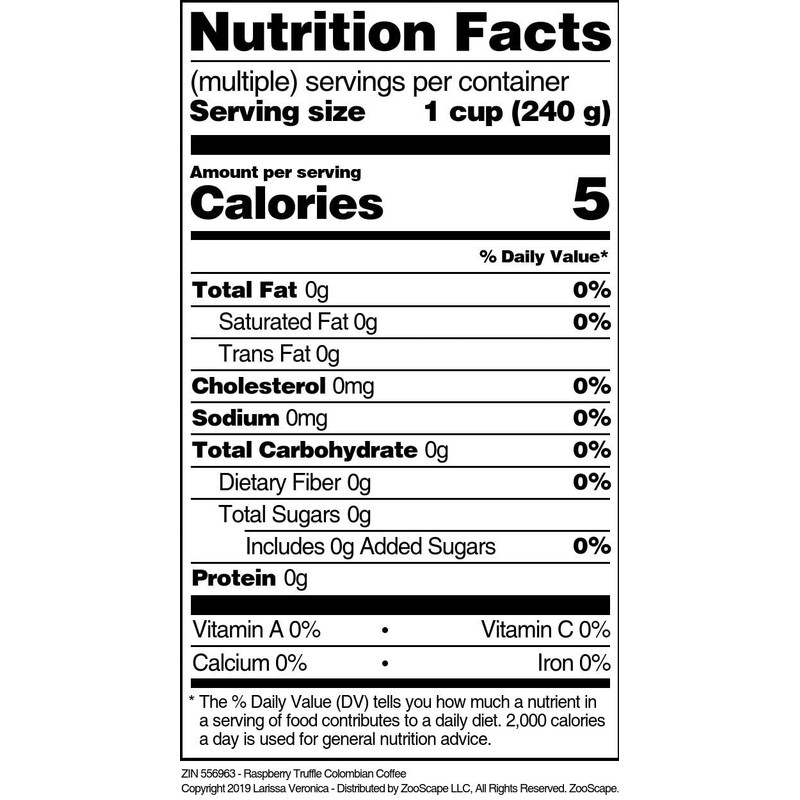 - Our Raspberry Truffle Colombian coffee is a wonderful, naturally flavored, medium-bodied Colombian coffee blended with Raspberries (Red), White Chocolate Chips and Hibiscus Flower. You will enjoy the Raspberry Truffle flavor and ingredients and the fine, mild Colombian coffee taste! - Ingredients: Colombian coffee (whole coffee beans), Raspberries (Red), White Chocolate Chips, Hibiscus Flower and Natural Raspberry Truffle Flavor.