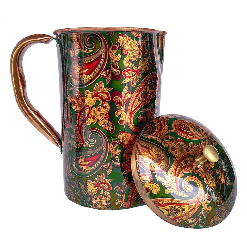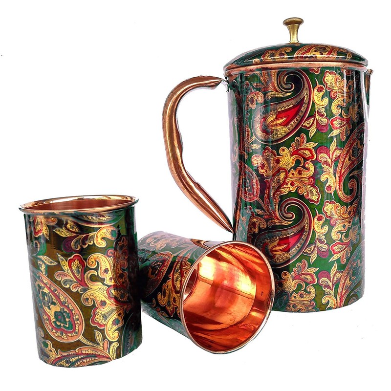 This is a solid copper pitcher and glass for water. It is waterproof screen printed on the outside, so it is an easy care product as the copper usually tarnishes after aging, and it looks very bad so we have printed and covered on the outside. It is a durable, robust product.