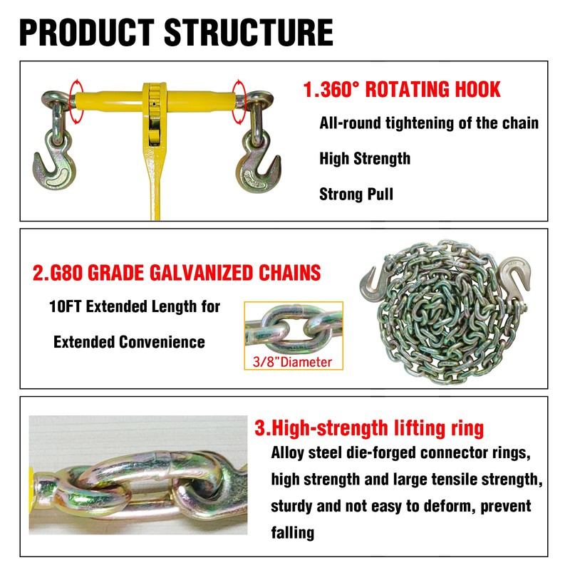 - Versatile & Compliant:Compatible with 3/8" to 1/2" chains, this binder is ideal for industrial sites, farms, and commercial hauling. It ensures reliability and compliance for all your heavy-duty binding needs.