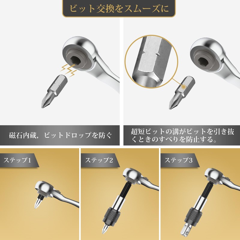 • Smooth Bits Replacement: The magnet built in the ratchet wrench set helps absorb bits securely. The groove of the ultra short bit prevents slipping when pulling the bit. High temperature tempering and special hardness of 60-62 HRC, these bits are durable and have good toughness. Plating surface design, anti-rust, wear-resistant