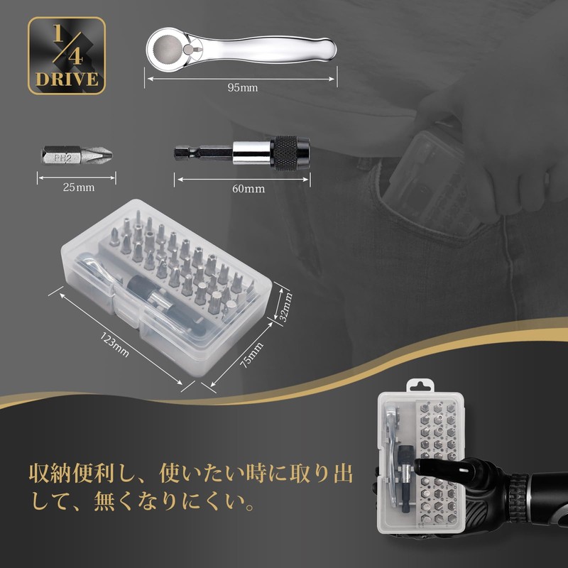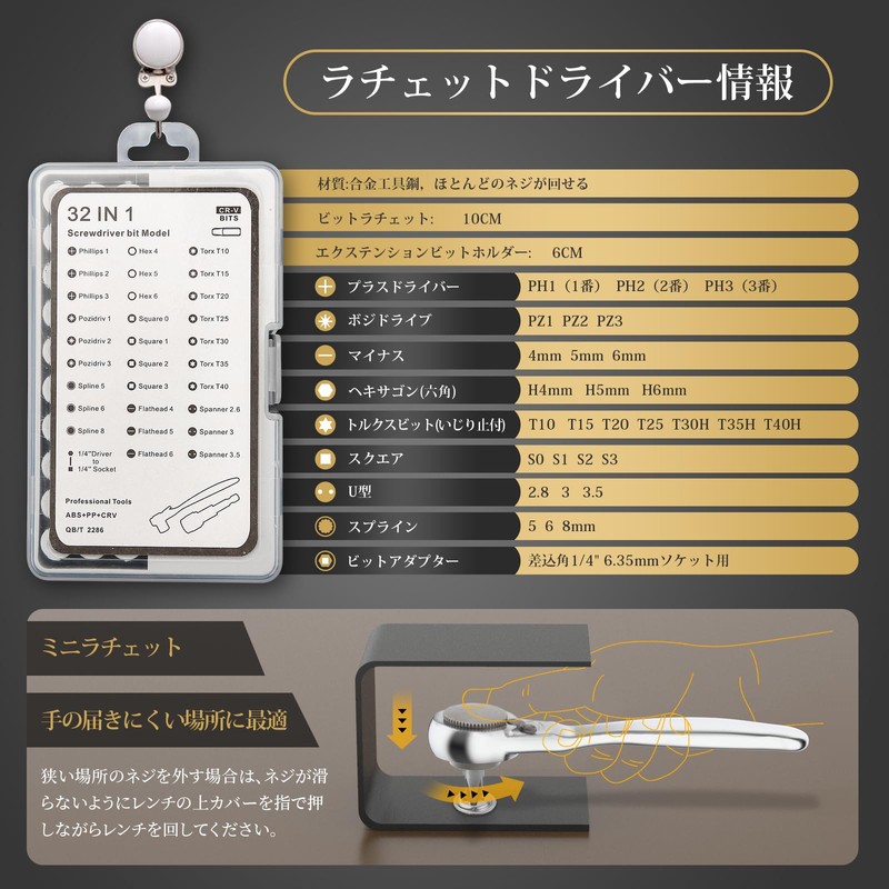 • Ratchet Screwdriver Set 32 Pieces: Bit ratchet, extension bit holder, screwdriver plus 1/2/3, boji drive PZ1/PZ2/PZ3, screwdriver bit minus 4/5/6mm, hexagon (with hex robe hole) H4/H5/H6mm, T-type Torx bit (with fidget) T10/T15/T20 T25 / T30H / T35H / T40H, Square (Coin Screwdriver Set) - S0/S1/S2/S3, U-Shaped - 2.8/3/3.5, Triple Square Bit (Triple Square) - 5/6/8mm, Bit Adapter (for 1/4" Drive Sockets)