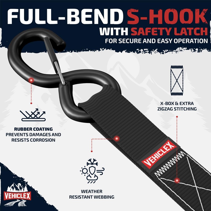 - Versatile applications: Secure your ATV, UTV, motorcycle, bicycle, canoe, kayak, or belongings during a move with durable straps; coated full-bend S-hooks ensure reliability