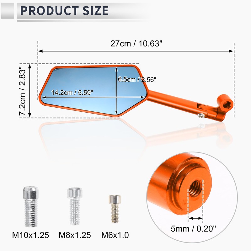 - Functionality:Type: Motorcycle Mirror, Position: Handle Bar, Material: Aluminum Alloy, Shell Color: Orange, Glass Color: Blue, Mirror Size: 14.2x6.5cm / 5.59"x2.56"(L*W), Total Size: 27x7.2cm / 10.63"x2.83"(L*W), Install Hole Diameter: 5mm / 0.20", Thread Size: M8x1.25, M10x1.25, M6x1.0.