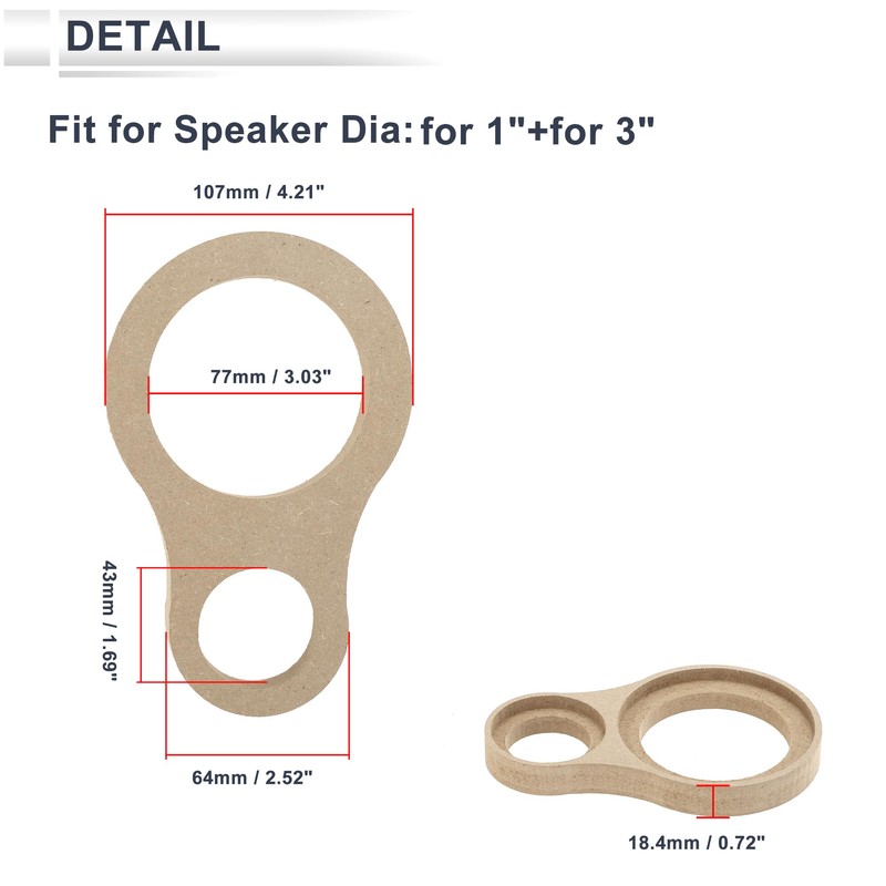 - Functionality:Fit for Speaker Dia:for 1"+for 3" Depth: 18.4mm / 0.72" Inner Diameter 1: 77mm / 3.03" External Diameter 1: 107mm / 4.21" Inner Diameter 2: 43mm / 1.69" External Diameter 2: 64mm / 2.52"