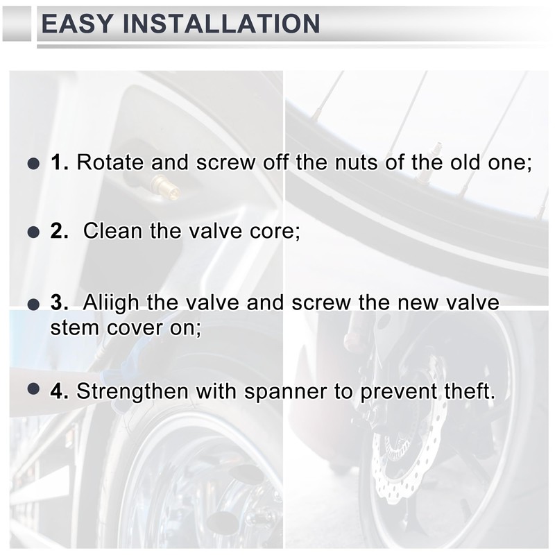 - Installation Steps:1. Rotate and screw off the nuts of the old one; 2. Clean the valve core; 3. Align the valve and screw the new valve stem cover on; 4. Strengthen with spanner to prevent theft.