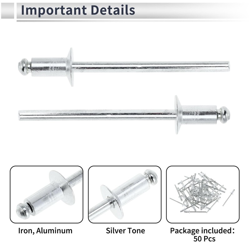 - Functionality:Product Name: Open End Large Flange Blind Rivets; Material: Iron, Aluminum; Color: Silver Tone