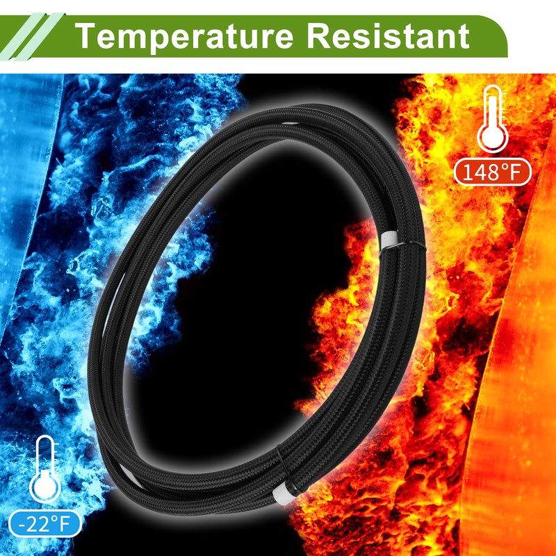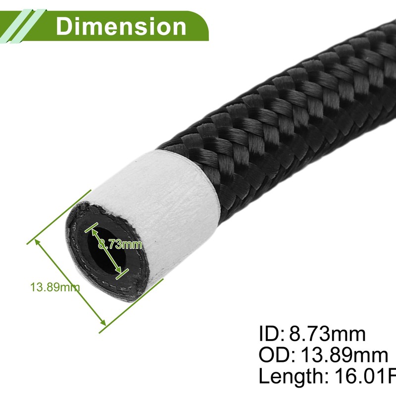 - High Temperature Resistant: Material: CPE Rubber,Nylon Braid; Length: 16.01FT; Hose Inner Diameter: 8.73mm; Hose Outer Diameter: 13.89mm; Hose Hole Size: AN-6; Pressure Rating: Working pressure: 1500psi; Burst pressure: 1600psi; Temperature Range: -104℉-266℉