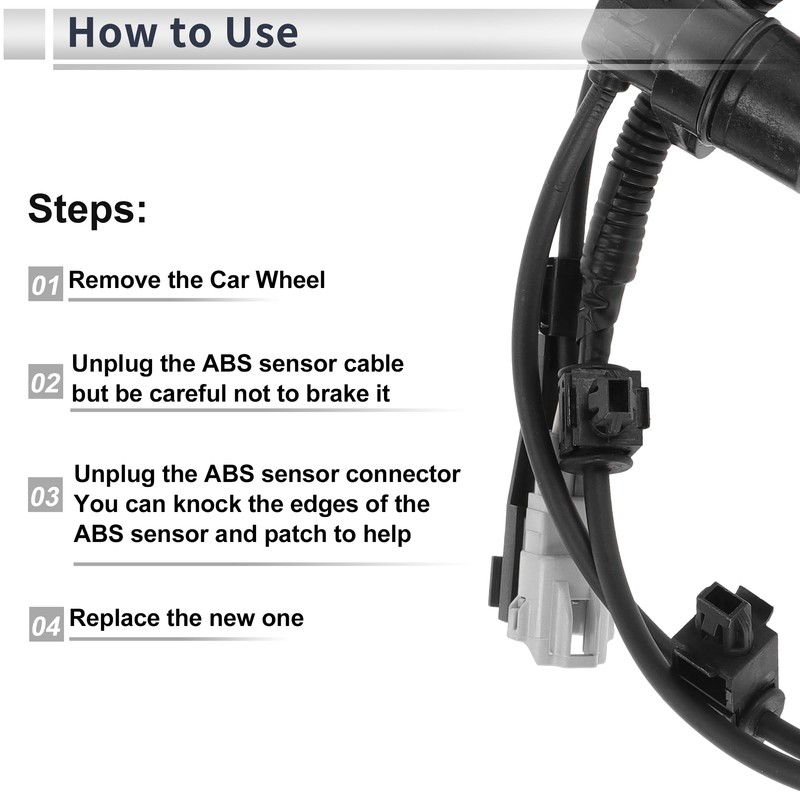 - Installation Steps:Easy Installation.Remove the car wheel, unplug the ABS sensor and sensor connector, then replace the new abs sensor.