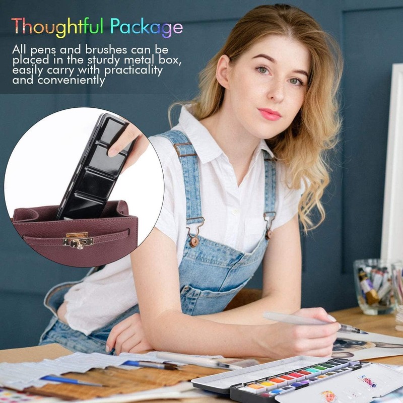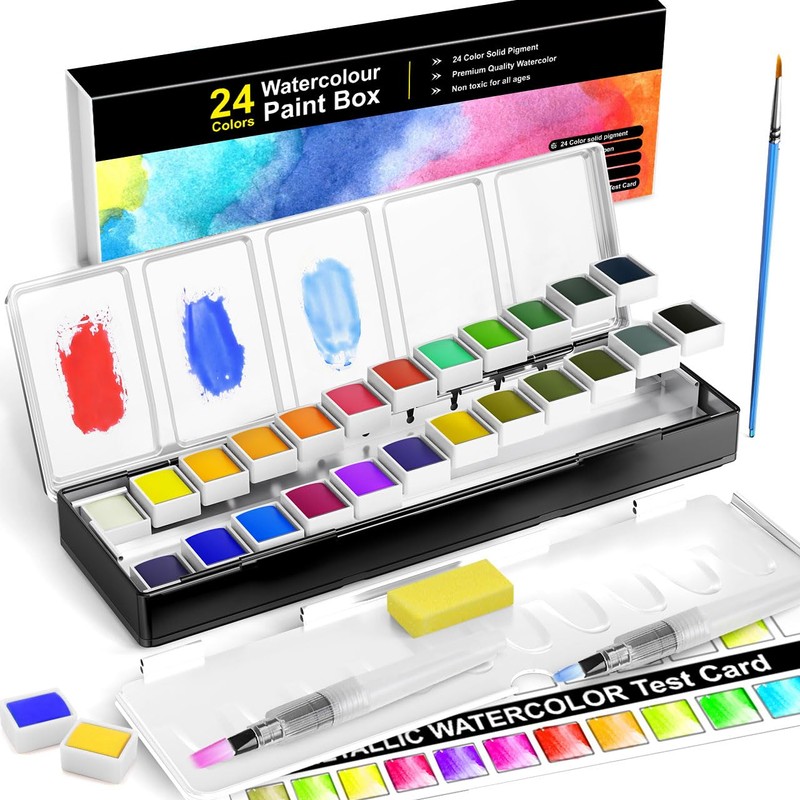 - Well-designed package: Ratel watercolour paint set with 24 full-colour pigments, 1 brush and 2 water tank brushes. The solid pigment comes in a sturdy metal box that prevents it from being damaged by shipping or tripping. The metal lid has 5 dividers and can be used as a mixing palette for easy mixing of watercolours. The packaging is well thought out and everything is made in premium quality.