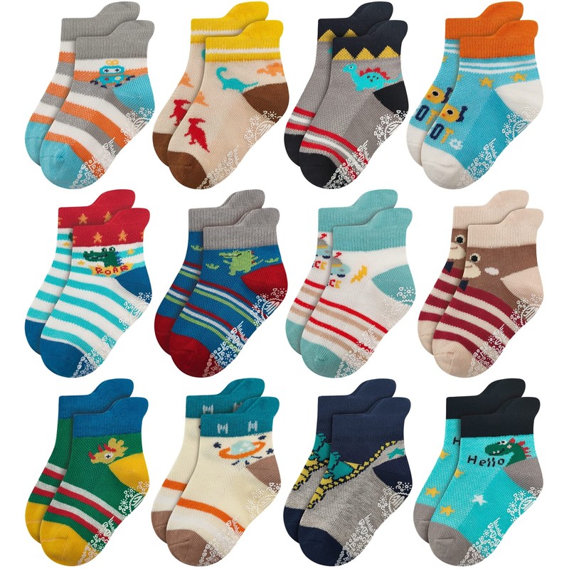 RATIVE Ankle Anti Slip Non Skid Organic Cotton Socks with Grips Grippers for 1 2 Years Old 2T 12 18 Months Toddler Boy Boys Girl Girls (2T-3T, 12-Pairs/Animal world)