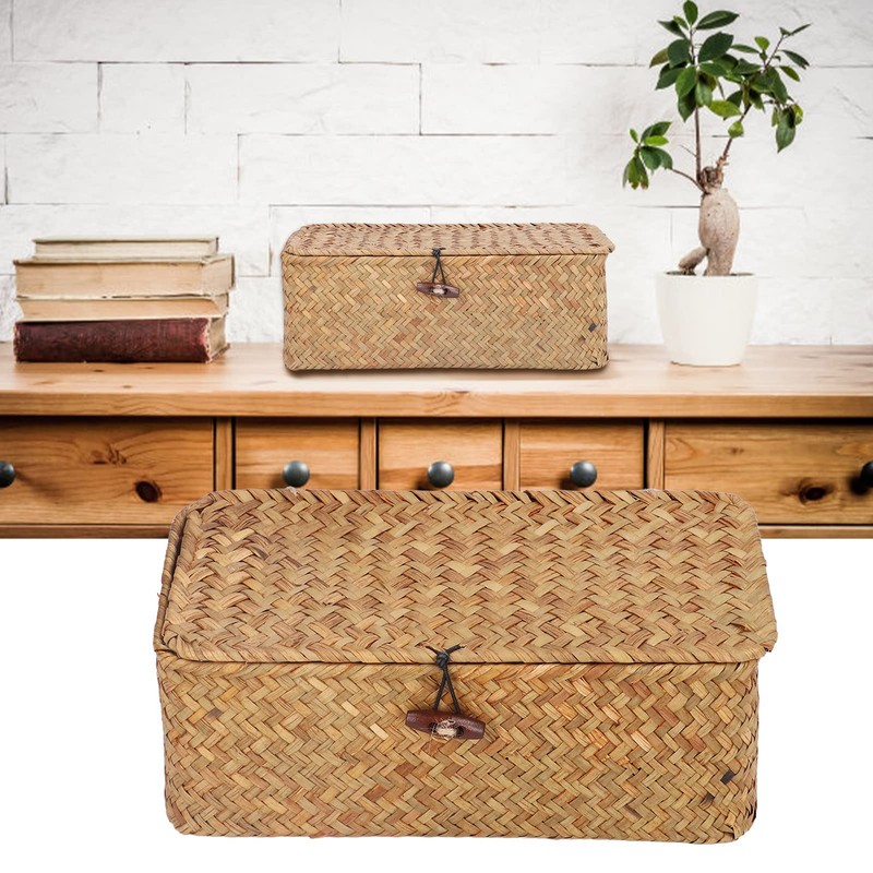 Rattan Basket Seagrass Storage Basket Baskets Containers Storage Container with Lid Rectangular Braided Storage Basket with Large Capacity for Clothes Fruit [S]