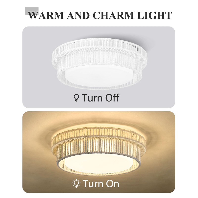 - 【LED Ceiling Light】 This flush mount ceiling light is made of 100% hand-woven natural rattan twine in white color and fixed on a sturdy metal frame, a LED module is embedded inside the frosted white glass lampshade, a unique and practical boho light without flicker and is eye-friendly for effortless charm overhead!