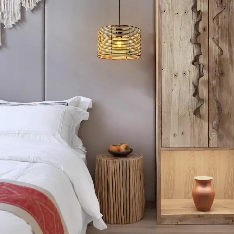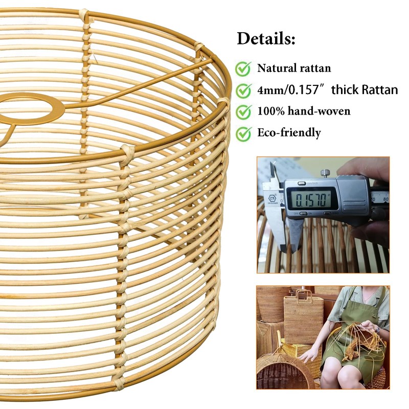 - Drum rattan Lamp shades Size: Diameter 11.9in, Height 7.08in; This rattan lamp shade is made of high quality rattan, handwoven , with a unique design.Drum boho lamp shade It is suitable for various styles of lamps, such as table lamps, floor lamps, pendant lamps, and chandeliers.