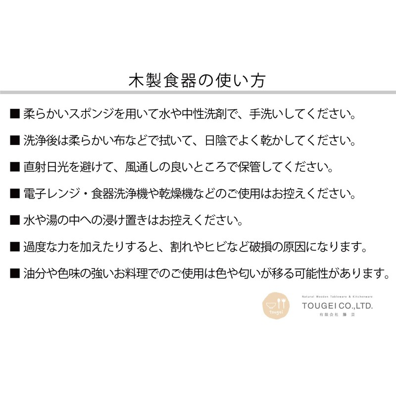 - [Handling Precautions] Due to the characteristics of wood, color, and size may vary slightly. ■ Hand wash with a soft sponge after use. ■ After washing, wipe with a soft cloth and dry in the shade. ■ Please avoid using in microwave, dishwasher, or dryer. ■ Please refrain from soaking in water for a long time. ■The urethane coating of this product complies with the standards of Japanese Food Sanitation Act for safety and peace of mind. ※Scene photos are for illustration purposes only