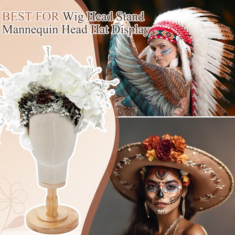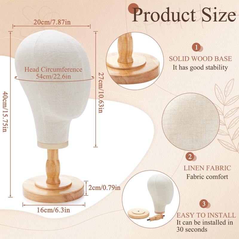 - Material Construction: the wig head stand has a robust and durable build, made from inner plastic, outer canvas, and supported by a solid wood base, ensuring it can be applied for the long time; With the design based on the real human head, it provides a nice opportunity to exhibit the effectiveness of wigs and other head accessories