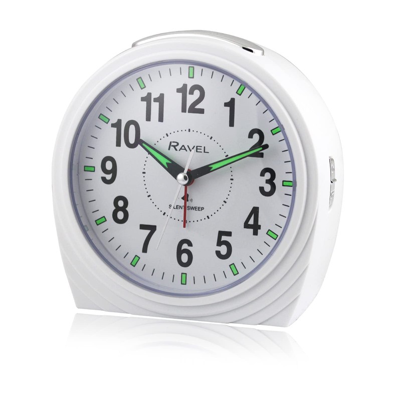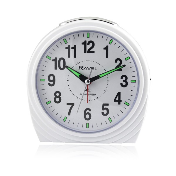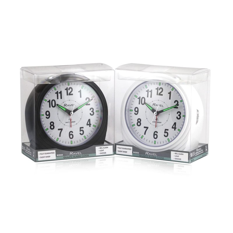 - Ravel's large, bold and ultra functional bedside / mantel bell alarm clock for the home. Featuring a clear white dial with super-bold black numbers that offers the complete easy-read option. The high-visibility, luminous-tipped hands and hour markers glow in the darkest of rooms. Available in white or black with a bell alarm.