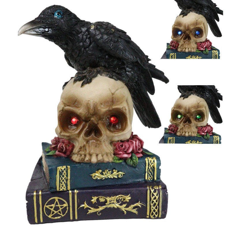 • Summon a raven skull out of your spell book and display it to the whole world! This gothic macabre sculpture features a peering black raven crow standing on a ghastly skull with color changing LED eyes and ancient books of prophecy under it. Use it as a decorative sculpture or as light duty Bookend and let the mystery and power of the Harbinger of Dawn enter your room!