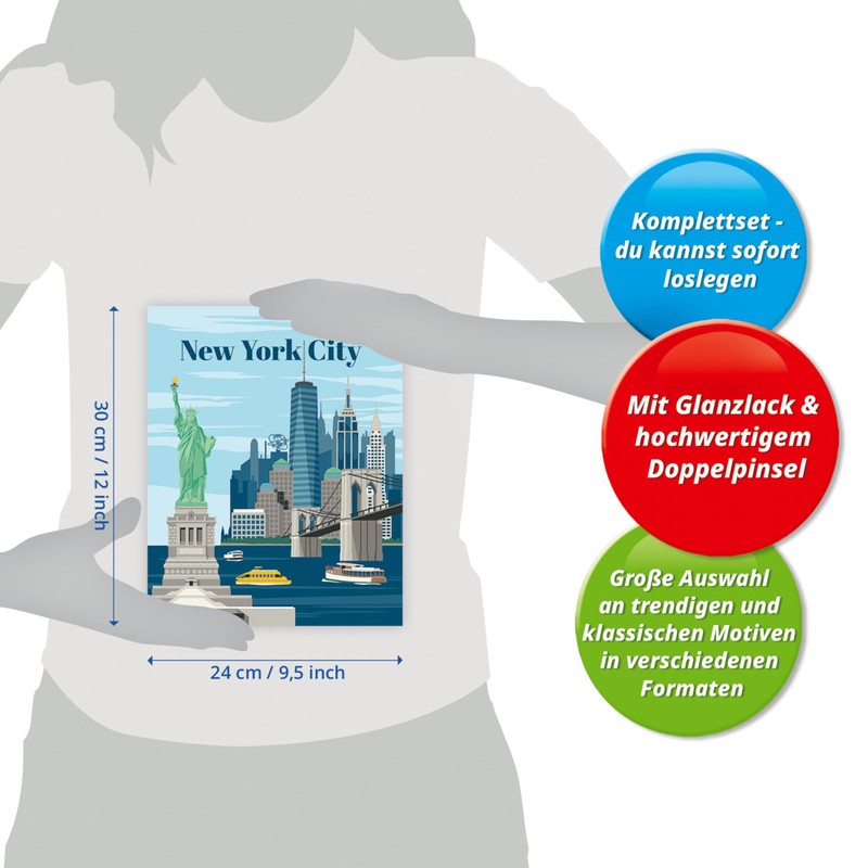 - The painting set contains ready-mixed acrylic paints in resealable and numbered bowls, a sturdy painting board in the format 30.00 cm x 24.00 cm, gloss varnish for finishing, a brush and instructions (English language not guaranteed). The high-quality acrylic paints dry quickly, are water-based, odourless and do not require a brush cleaner