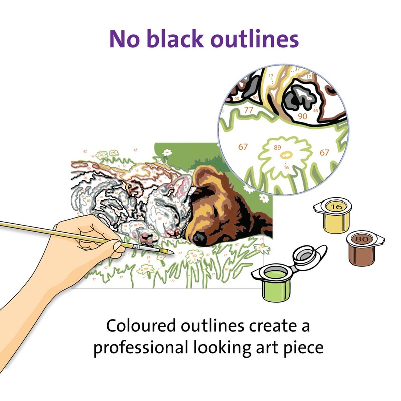 - This craft kit includes; high quality thick painting canvas, 10 acrylic paints in numbered pots, premium palette to hold the pots, fine point durable paintbrush for detail painting, easy to follow guide sheet and a sturdy presentation frame to display finished artwork.