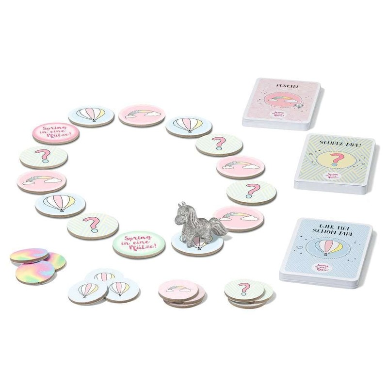 • Pull the cute glitter unicorn over the task plates and ask yourself the exciting and funny questions and tasks. Get to know you even better and collect point chips. The player with the most points wins the game.