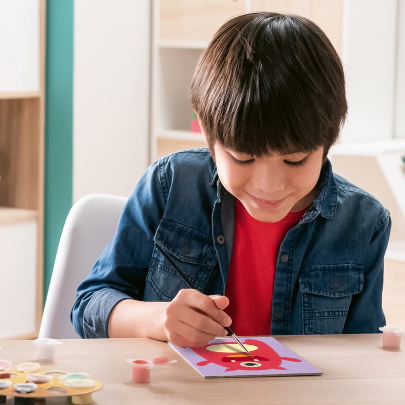 • The painting set contains 6 child-friendly acrylic paints in resealable and numbered bowls, a sturdy painting board in the format 12.00 cm x 8.50 cm, a matching frame and a brush