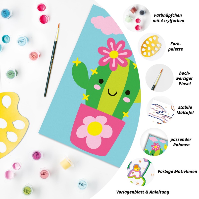 • The painting set contains 6 child-friendly acrylic paints in resealable and numbered bowls, a sturdy painting board in the format 8.50 cm x 12.00 cm, a matching frame and a brush. The high-quality acrylic paints dry quickly, are water-based, odourless and do not require a brush cleaner