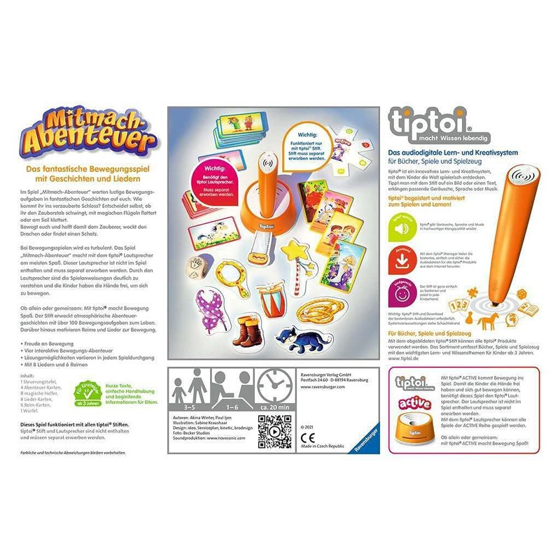 • 4 adventure cards, 8 magic helpers and 1 cube provide new movement tasks again and again. 6 rhyming cards and 8 song cards complete the experience. Tiptoi pen and speaker not included, must be purchased separately