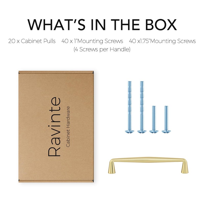 For over a decade, Ravinte has always been committed to bringing the best home revitalization experience to our users for we deeply understand what does a beautiful and fashionable house mean to a whole family.The cabinet handle finished with Brushed Brass provides an elegant modern flavor to your cabinet and even your whole room.Fashionable and sturdy design coordinates with many décor themes, and are proven to be functional and elegant through years of use.Zinc Alloy handles can be used anywhere in the house to revitalize your kitchen or bathroom and provide any furniture decoreation. 10 pack handles in coordinating design can also be applied in cabinet drawers.Decorative Cabinet Hardware Revitalization with cabinet pulls for accenting the décor and style of existing cabinets or furniture. Decoration with our cabinet handles provide you with great convenience to enjoy the look and feel of an entire room.Zinc Alloy Cabinet handles Adds a Distinguished Look The cabinet bar pulls elaborately crafted and designed to beautify your house with their simplicity. Tough sturdy Design The lightweight but sturdy cabinet pull is built to withstand over years of wear and tear.They have a nice weight to them and come individually wrapped to protect against any scratches.Sleek Appearance Quick and easy install Screws included