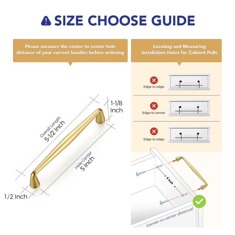 • Standard Measurement : This cabinet pull features a center-to-center hole spacing of 5 inches (128 mm). If you're replacing an existing handle, ensure the current handle has the same hole spacing for a proper fit