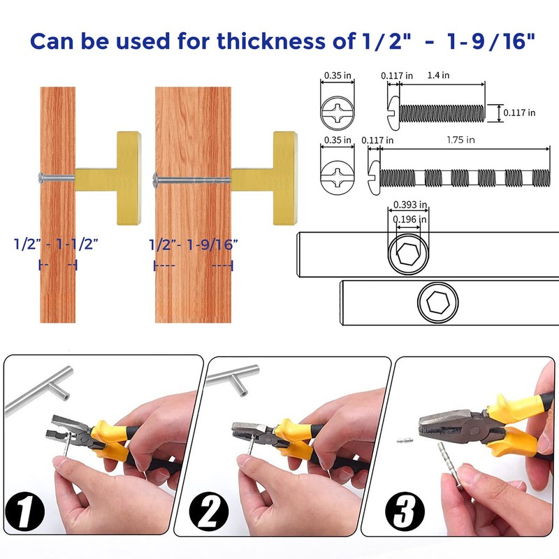 - EASY TO INSTALL: Drill a hole at the position you want and then tight to the knob. Also, our drawer knobs come with 2 different sets of screws of different lengths (one set has notches to easily cut to different lengths)