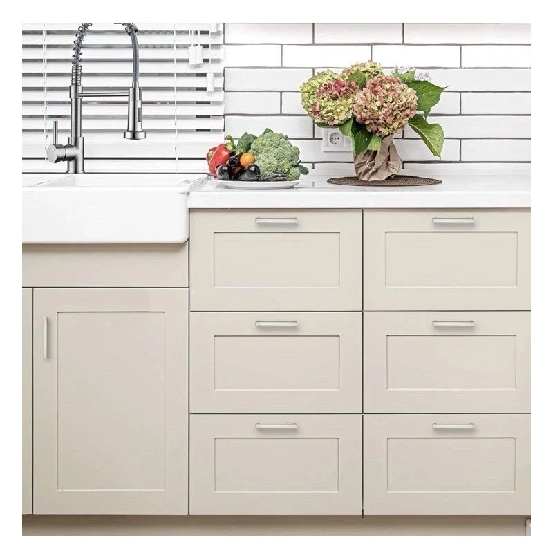 Simple look: The Brushed Nickel cabinet handles have a wide appeal across a range of kitchen cabinet doors and drawers The Satin Nickel handles have a clean and timeless look that works with farmhouse, vintage, traditional and transitional styles