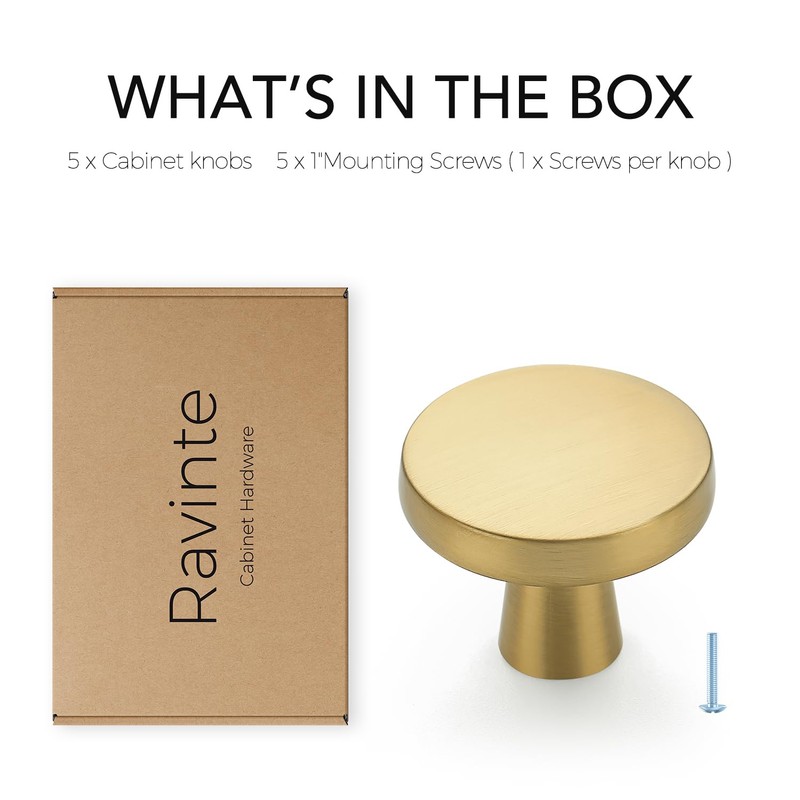 - Easy Installation: Cabinet door knobs have a single hole that is easy to install into the pre-drilled hole by including mounting screws. 5 Pack Brushed Brass cabinet knobs include 5 pcs 1 inch short screws