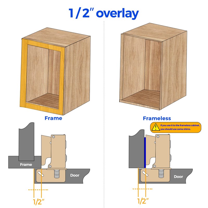 - Excellent Function: The cabinet hardware applies to a 1/2 inch overlay face frame cabinet. The soft self-closing hinges make you free from reminding kids not to slam the doors. The adjustment is easy to perform. It can be widely used in furniture, kitchen cabinets, bathroom storage cabinets, and other spaces cabinets. If you need to keep the door from opening past 90 degrees, you should order some hinge angle restriction clips.