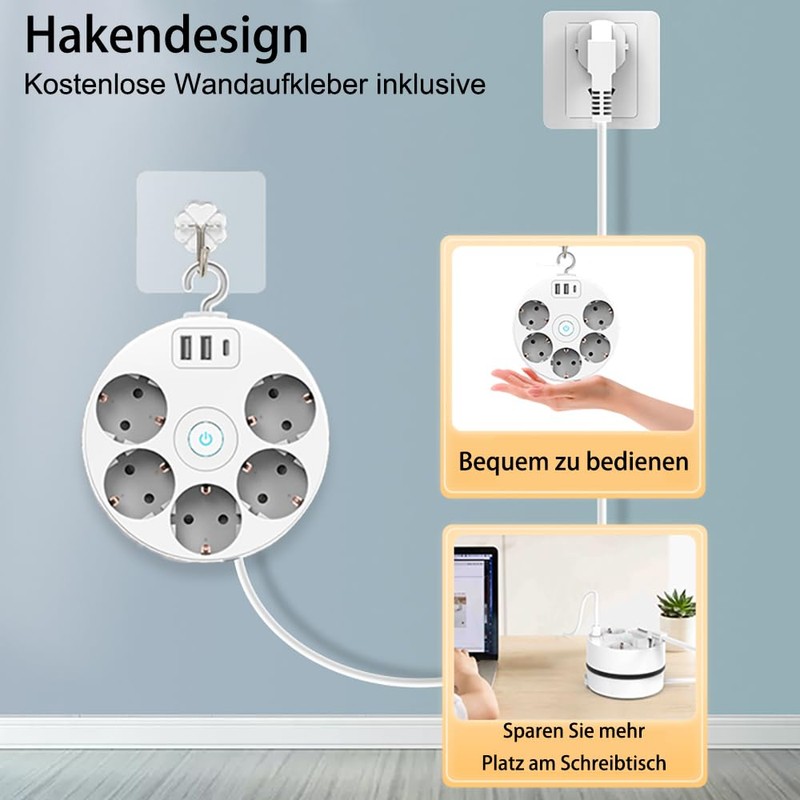 - ✅【 5 Fach Steckdosenleiste Rund 】Die Steckdosenleiste 5 Steckdosen (Max 250V,16A), 2 USB-A Anschlüsse und 1 Typ-C Port mit einem 1.5 m langen Netzkabel, die bis zu 8 Geräte aufladen können.