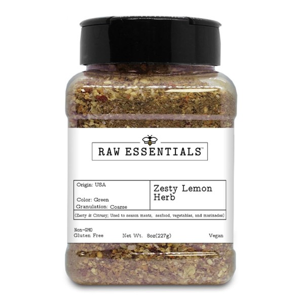 Raw Essentials Zesty Lemon Herb – Zesty and Citrusy Flavor for Meats, Seafood, Veggies, Stir-Fries, & Marinades – Non-GMO, Gluten-Free, Vegan – 8 Ounce Bottle