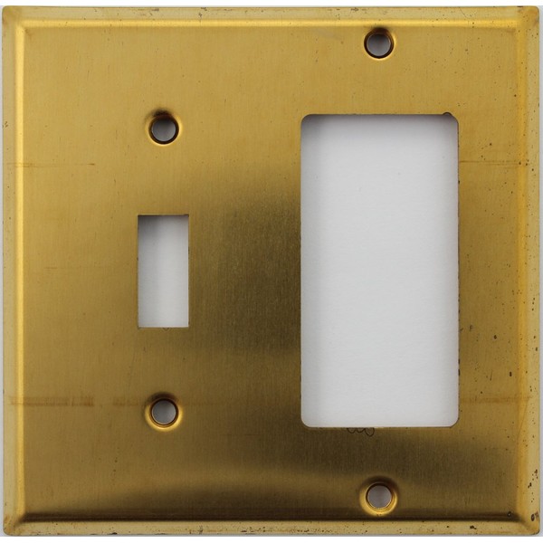 This two gang wall plate is a raw brass cover plate that will accommodate one standard toggle switch and one standard GFI outlet, rocker switch or any other rocker opening devise. The finish on this plate is a raw, unpolished brass that will have scratches, blemishes and watermarks on them. They do not have a protective coating on it so the plates will petina with age or you can use a brass aging solution to create your own finish. Plate measures 4 1/2" by 4 1/2"