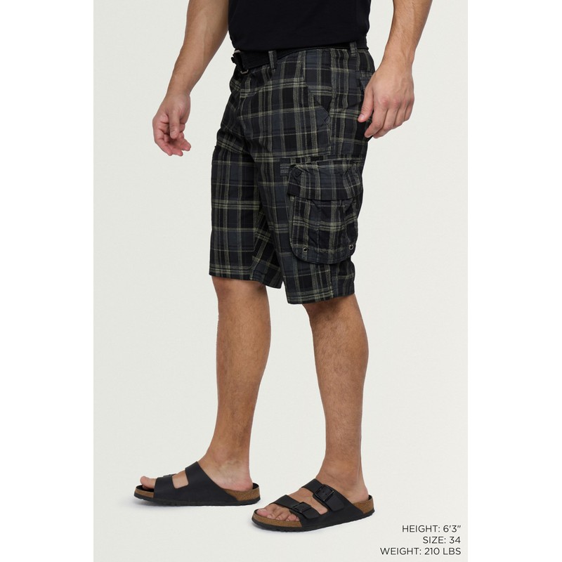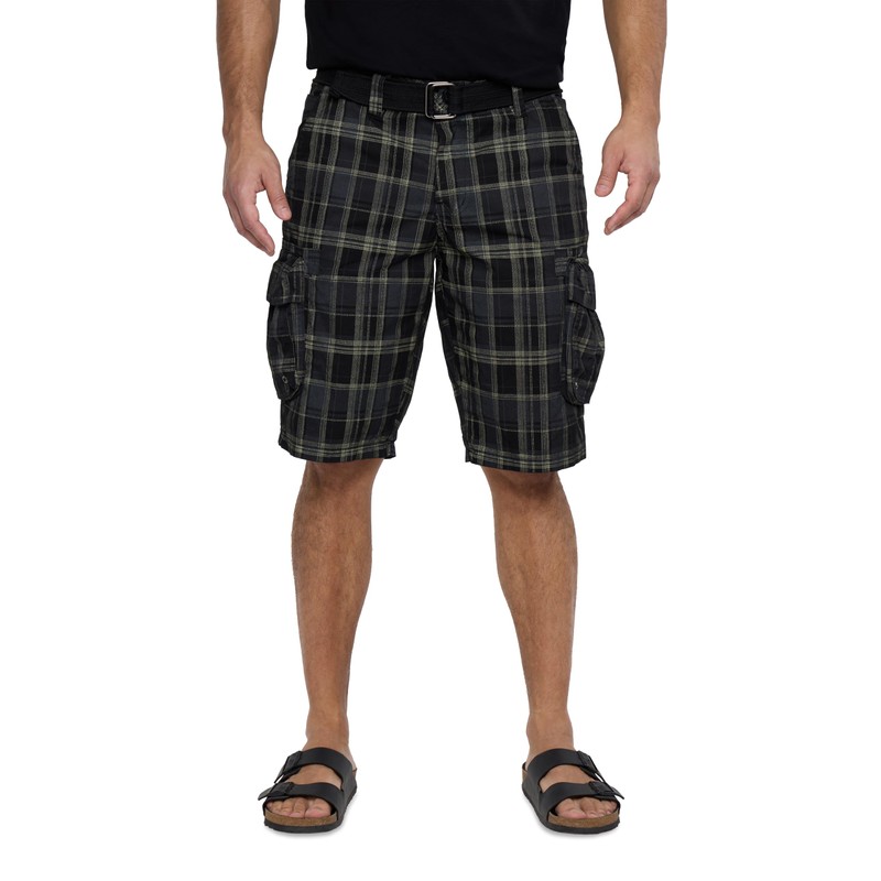 RAW X Mens Belted Cargo Shorts, Relaxed Fit Casual Knee Length Cargo Shorts for Men -Plaid Black -38