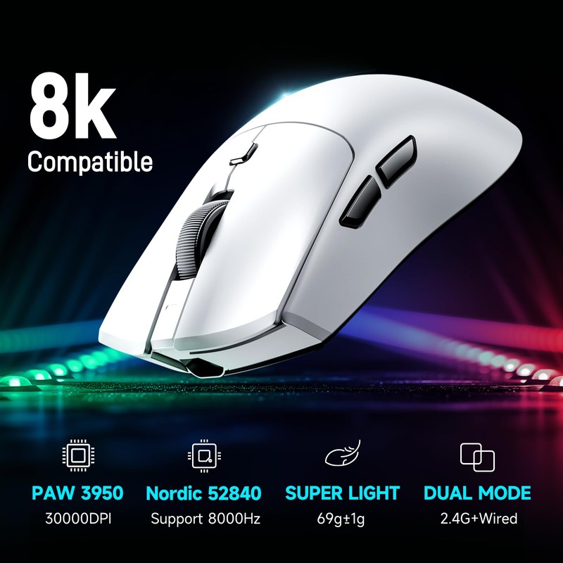 RAWM Wireless 8K Lightweight Gaming Mouse, PAW3950 Optical Sensor, 30000 DPI, 600mAh Rechargable Battery, 7 Programmable Buttons, Hot Swapple Design