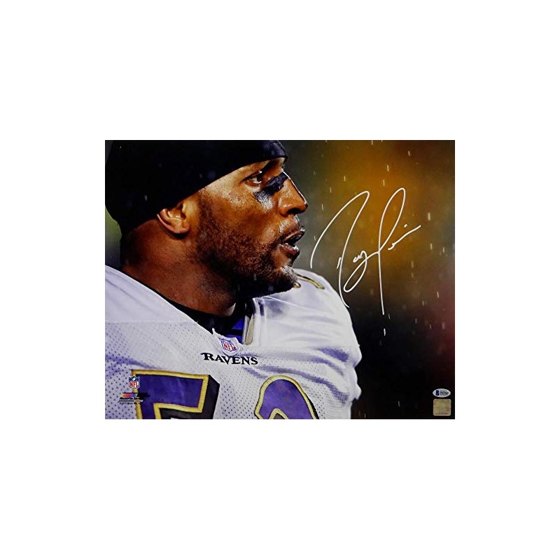 Ray Lewis Signed Ravens 16x20 PF Close Up In Rain Photo - Beckett Auth *White